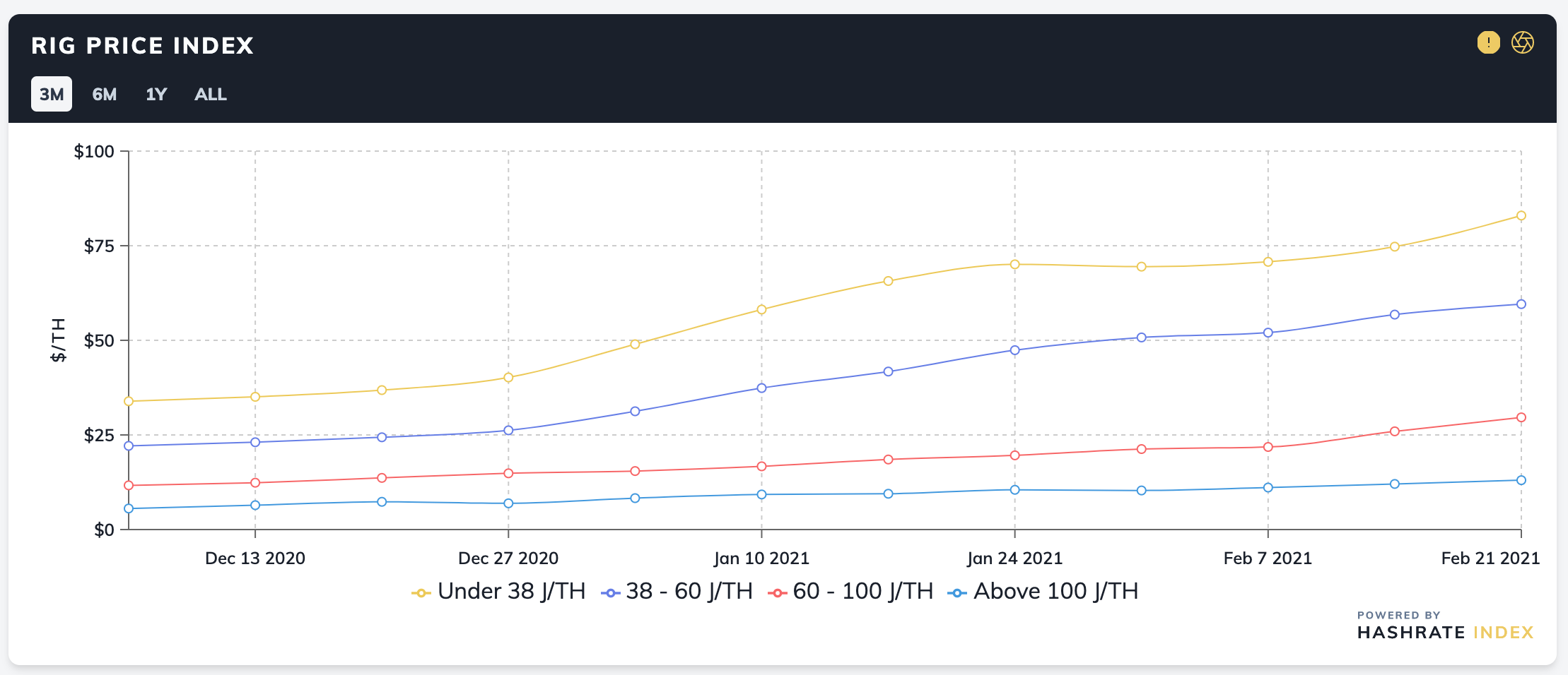 New-generation equipment increased 11% during the period and is now up 70% this year. Bitmain started taking orders for the October 2021 batch of S19Js (90TH). They were going for about $5,750 a rig, which is $64/TH. We have been seeing a premium of above 20% if you want delivery today compared to May delivery.