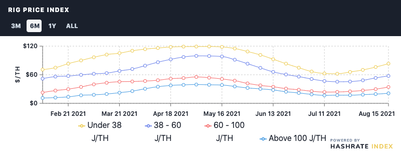 For example, mining profitability is nearly at a yearly high and rig prices are inching towards the levels we saw this Spring when bitcoin hit its all-time high.