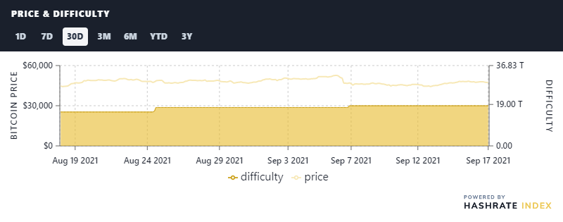 Bitcoin is knocking on the door of $50,000 again, however, after revisiting the low $40,000s last week. If it breaks above (and stays above), we will hashprice test this yearly high once again.