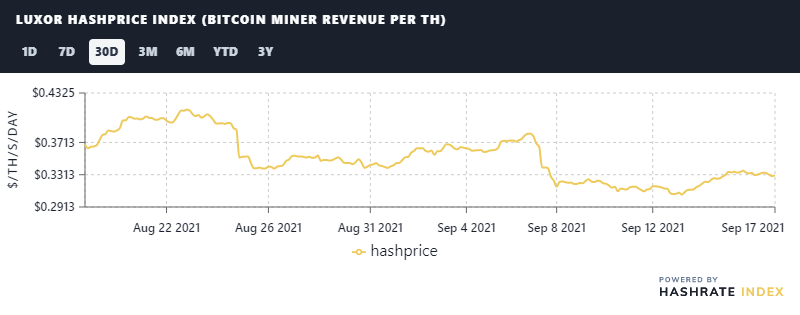 Hashprice is well below its yearly high at $0.33/TH, a 19.5% decrease from the $0.41 high it set in April.