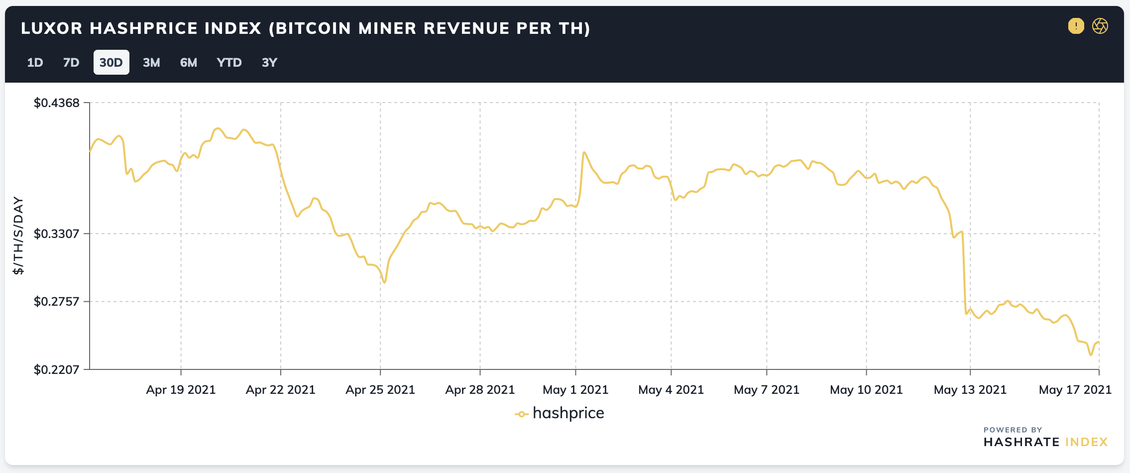 Mining revenue has decreased 33% on a USD basis since the last update, partially caused by a fall in Bitcoin price of 23%. On a BTC basis, hashprice is down 13% as network difficulty increased by 22% last Thursday. With the recent movement of miners to Sichaun (covered below), difficulty will likely decrease ~6-10% next adjustment.