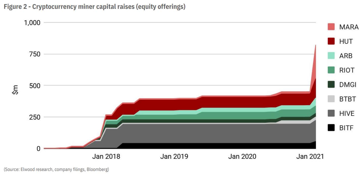 Publicly listed companies have been on a fundraising tear. Elwood research did a good job of mapping these raises out as shown below. Established mining companies such as Genesis Mining are no doubt eyeing the strong market cycle and attractive valuation multiples. If the market continues this way we may see quite a few new companies become publicly traded this year.