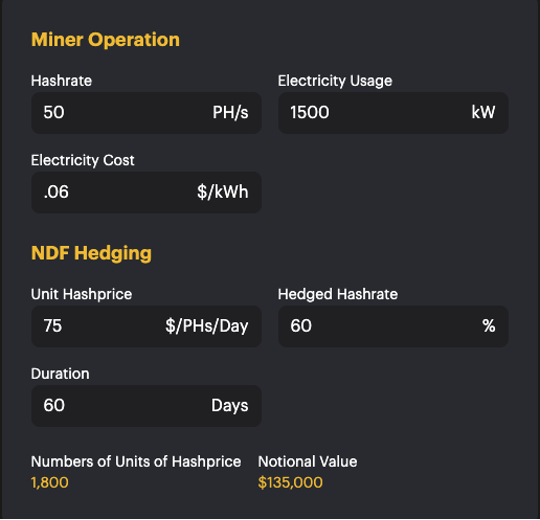 To do this, they could sell 1,800 (30PH x 60 days) Hashprice NDF contracts. If the miner sells these contracts at $75.00, they have locked in their revenue (hashprice) for that amount of hashrate.