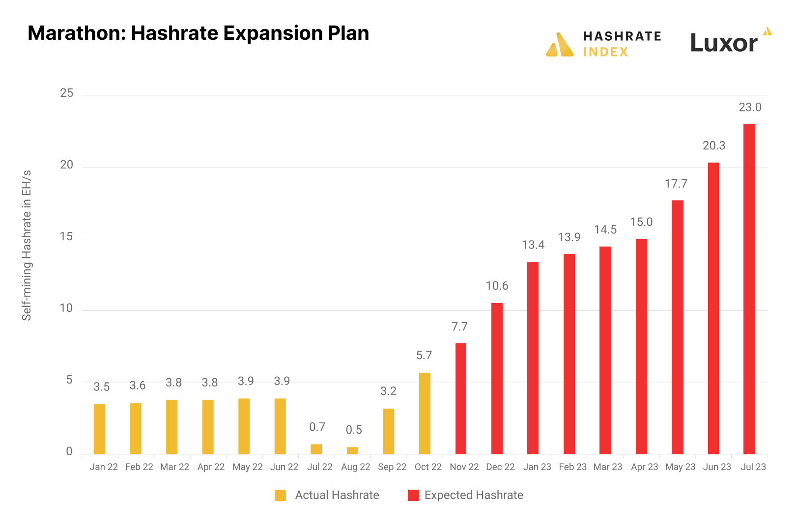 Marathon stated in January 2022 that it expected 13.3 EH/s to be hashing in mid-2022 and 23 EH/s by early 2023. Fast forward to May 2022, and the company had only managed to plug in 3.9 EH/s. This operating capacity plummeted to only 0.5 EH/s in August 2022 due to problems at the Montana power plant that powered most of its machines and energization delays at its Compute North hosting facility.