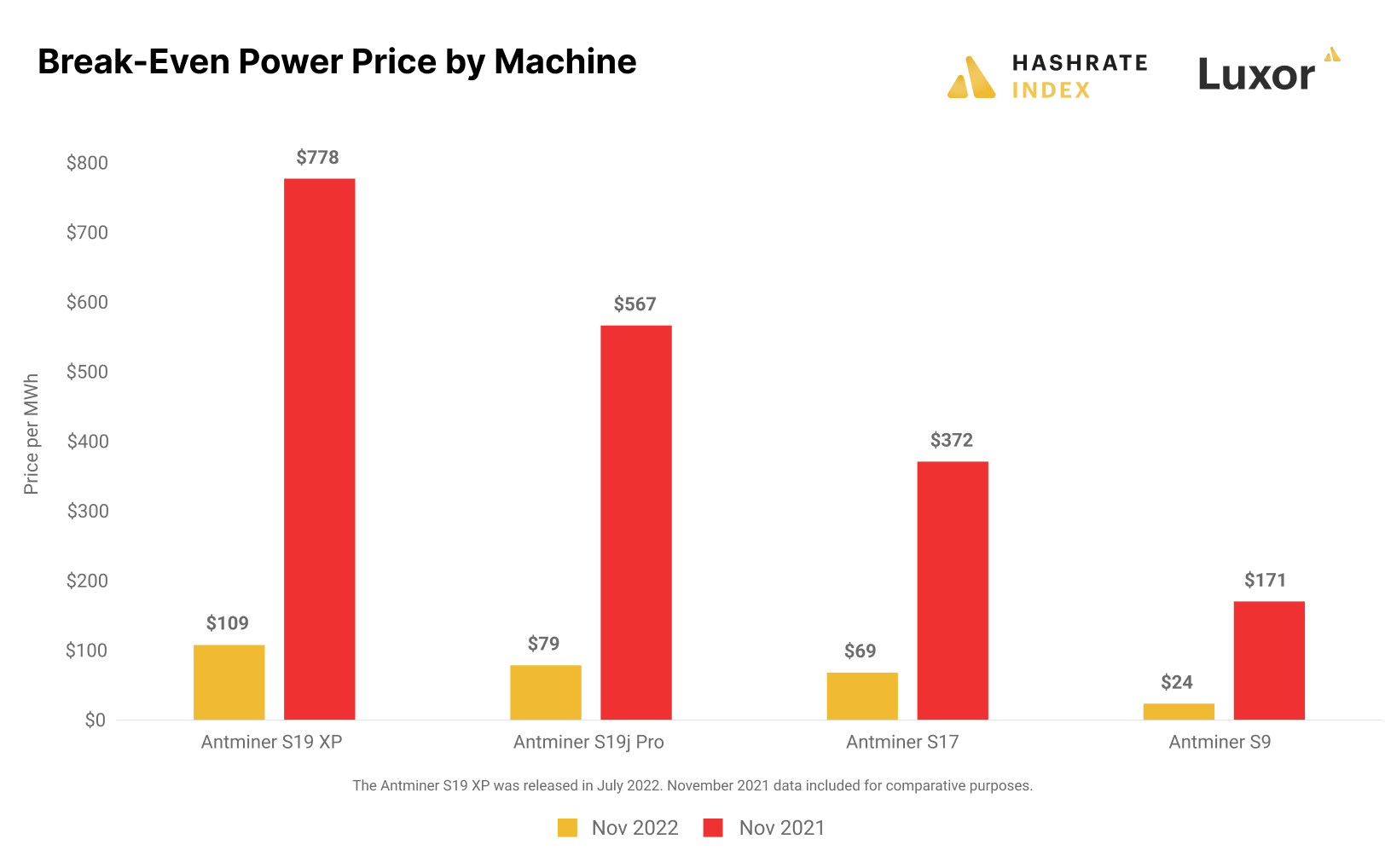 If 2021 was the year of relentless expansion, 2022 is the year of maximizing efficiency. To better understand how the bear market forces miners to minimize electricity costs, I have created a chart showing how the break-even electricity prices for different machines changed between November 2021 and November 2022.