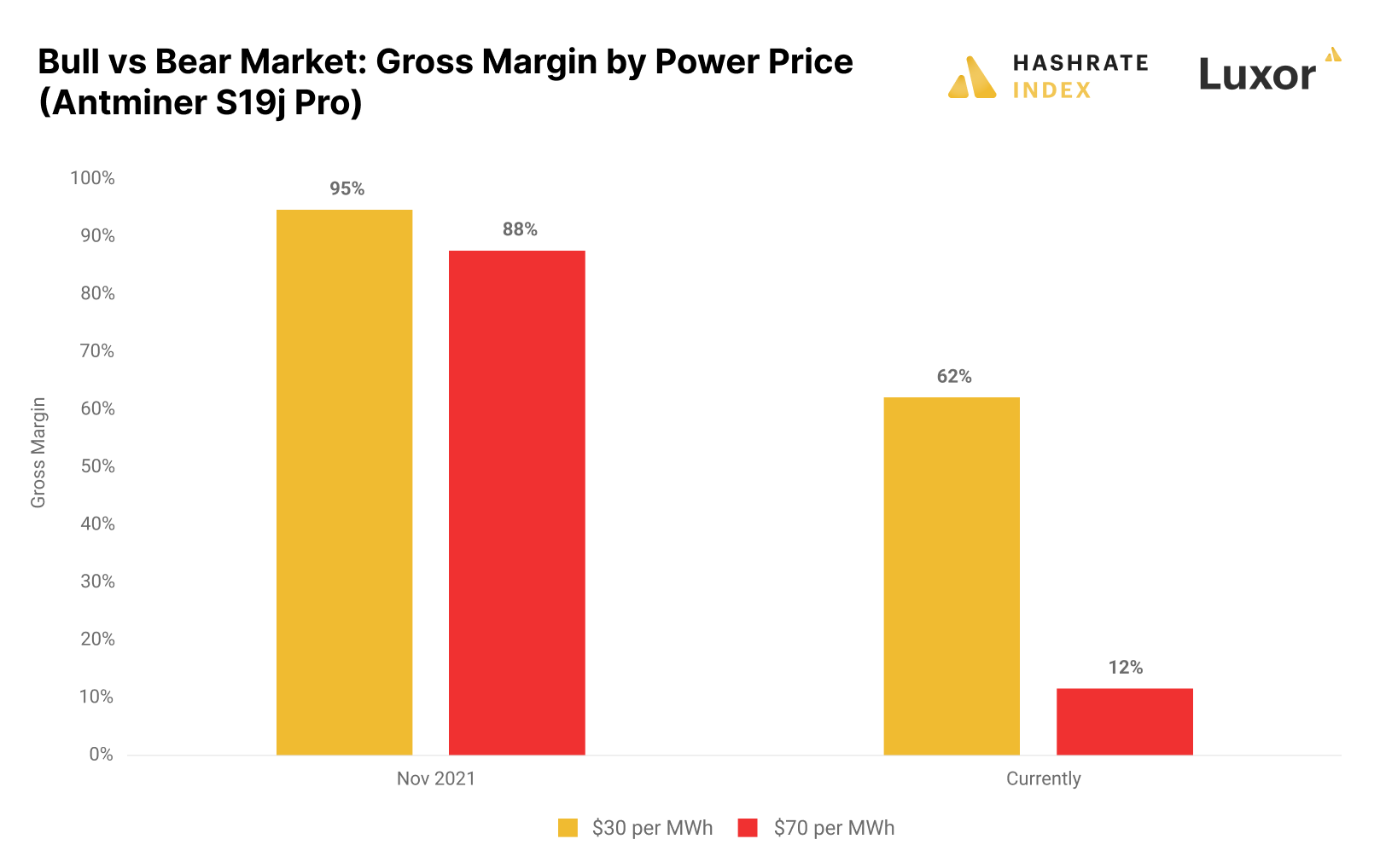 Things look vastly different now in the depths of the bear market. The difference between having access to $30 or $70 per MWh is now a whopping 50% in gross margin. The prudent miner paying $30 per MWh still achieves an excellent gross margin of 62%, while the miner paying $70 per MWh barely scrapes by with a meager 12% gross margin.