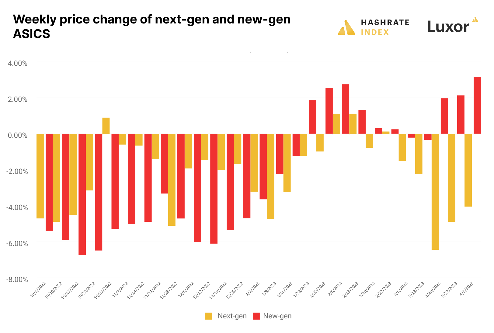 To start unpacking this, let's take a look at weekly price changes for next-gen and new gen ASICs over the last two quarter.