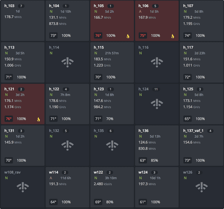 Heat Maps a visualized overview of your entire mining operation. Can input the facility/container number, rack number, position on rack, type of ASIC etc to get a complete view. An example of a heatmap from HiveOS is below.