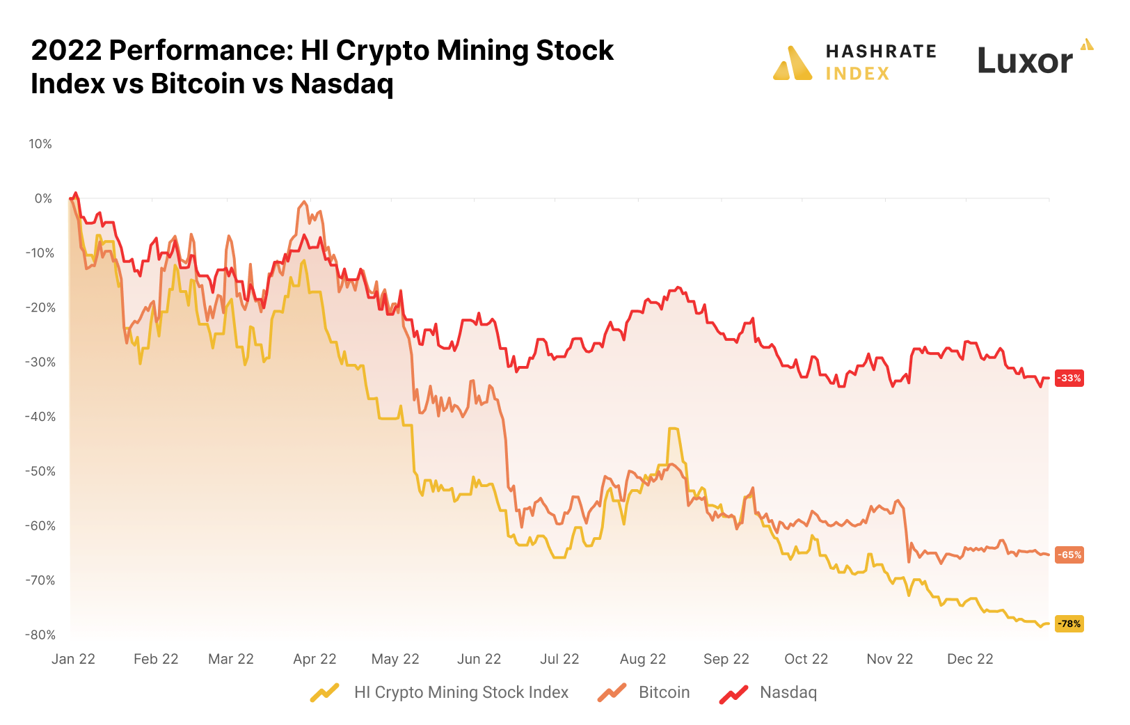 Hashrate Index’s Crypto Mining Stock Index fell by a staggering 78% in 2022, compared to a 65% drop in the bitcoin price and a 33% decline of the Nasdaq. It’s well known that mining stocks can give investors high beta exposure to bitcoin. Unfortunately, this high beta property also holds true during the worst of bitcoin bear markets, meaning that the severe underperformance of mining stocks relative to bitcoin in 2022 was not unexpected. In 2022, the daily correlation between the Hashrate Index Crypto Mining Stock Index and bitcoin was 0.96.