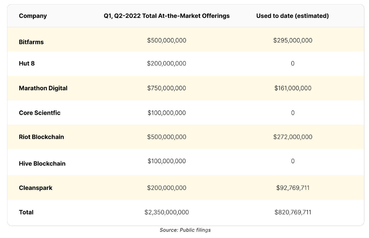 Recently, Cleanspark raised more ATM equity funding through an $500 MM offering from HC Wainwright. Entering 2023, there is at least $2 billion in potential equity funding available to the top public Bitcoin miners. Based on public disclosures, the following table shows the significant amount of funding available through ATM shelf offerings for public Bitcoin miners, as well as an estimate based on filing information for how much ATM funding public miners have tapped.