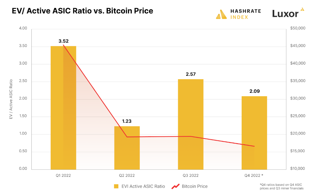 Based on the chart above, investors can see the various upwards and downward adjustments quarter over quarter. During the first half of the year, the bitcoin price was much higher and investors placed higher expected values on mining stocks, with the EV/Total ASIC Value sitting at 3.52. As the bear market clawed its path in Q2 2022, the EV/Total ASIC ratio hit 1.23, its lowest level of the year. As the bear market continued the rest of the year, the ratio adjusted a bit higher reflecting cash on hand being used for fleet growth, while simultaneously seeing mining rig values fall sharply.