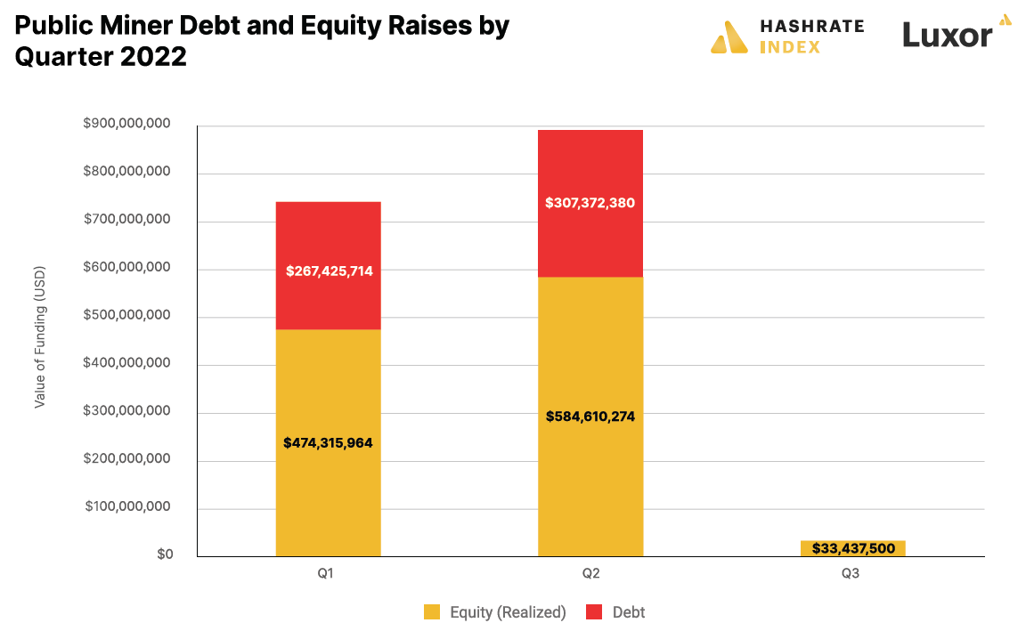 Part of the reason why public miners started to struggle in 2022 was that their capital tap was shut off. For the past two years, the public miners became accustomed to strong equity and debt markets. As you can see on the chart below, public miners raised $750 million in Q1 2022 and $900 million in Q2 2022, mostly consisting of equity. In Q3, they only managed to raise $33 million.