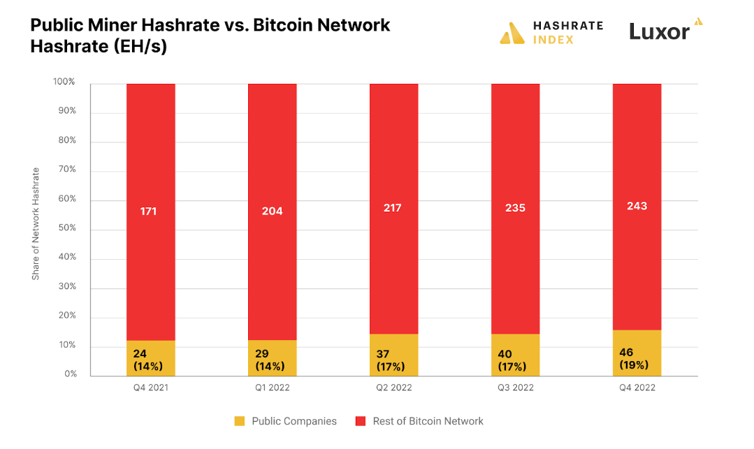 In 2023, we expect the public miners’ share of the Bitcoin hashrate to keep increasing. Most of these miners came nowhere close to reaching their capacity expansion plans for 2022, leading them to push these plans to mid-2023. Rising energy costs, build-out delays, and other disruptions hampered hashrate growth for certain public miners in 2022.