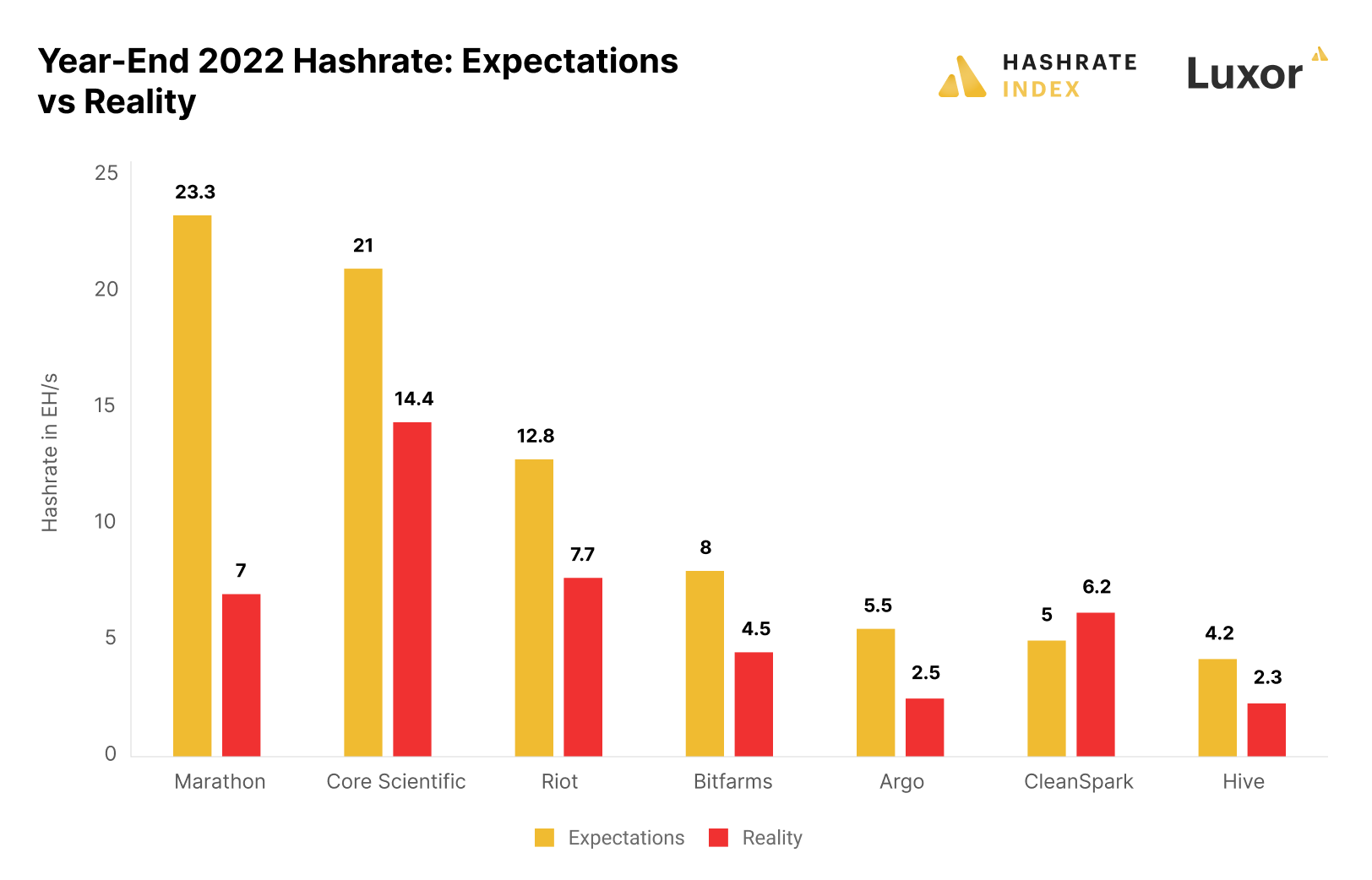 The chart above compares the public miners’ stated hashrate goals for year-end 2022 with their actual hashrate at this time. All the miners in the chart, except for CleanSpark, were far from reaching their 2022 hashrate goals. Marathon was the furthest away from reaching its goal, as it aimed to have 23.3 EH/s plugged in by year-end 2022 but only achieved 7 EH/s.