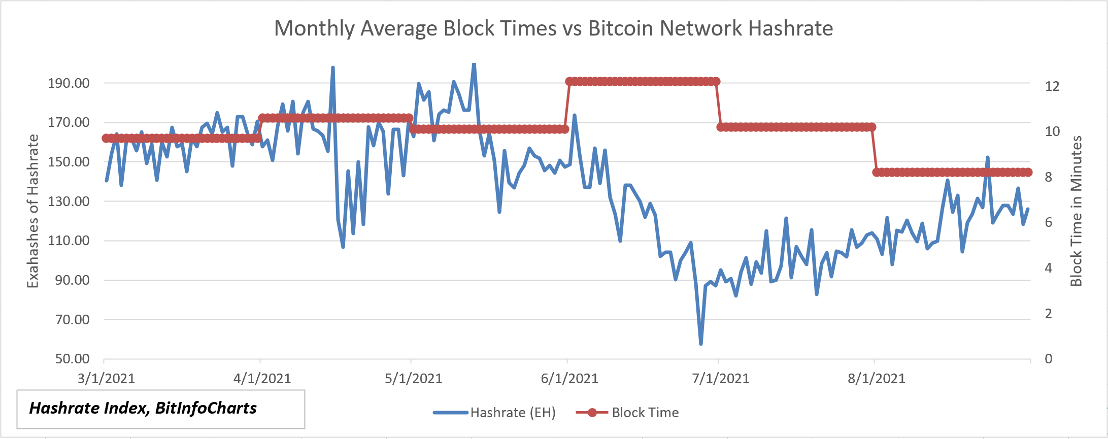 And how fast were miners minting new blocks? In August, the average block time was 8.1 minutes, nearly two minutes faster than the 10 minute average specified by Bitcoin’s source code. In May we saw the opposite problem: with half of the network offline nearly overnight in response to the CCP’s crackdown (and miners still operating under a difficulty that was set when the mining industry’s computing power was around 150 exahashes), average block times were 12.2 minutes.