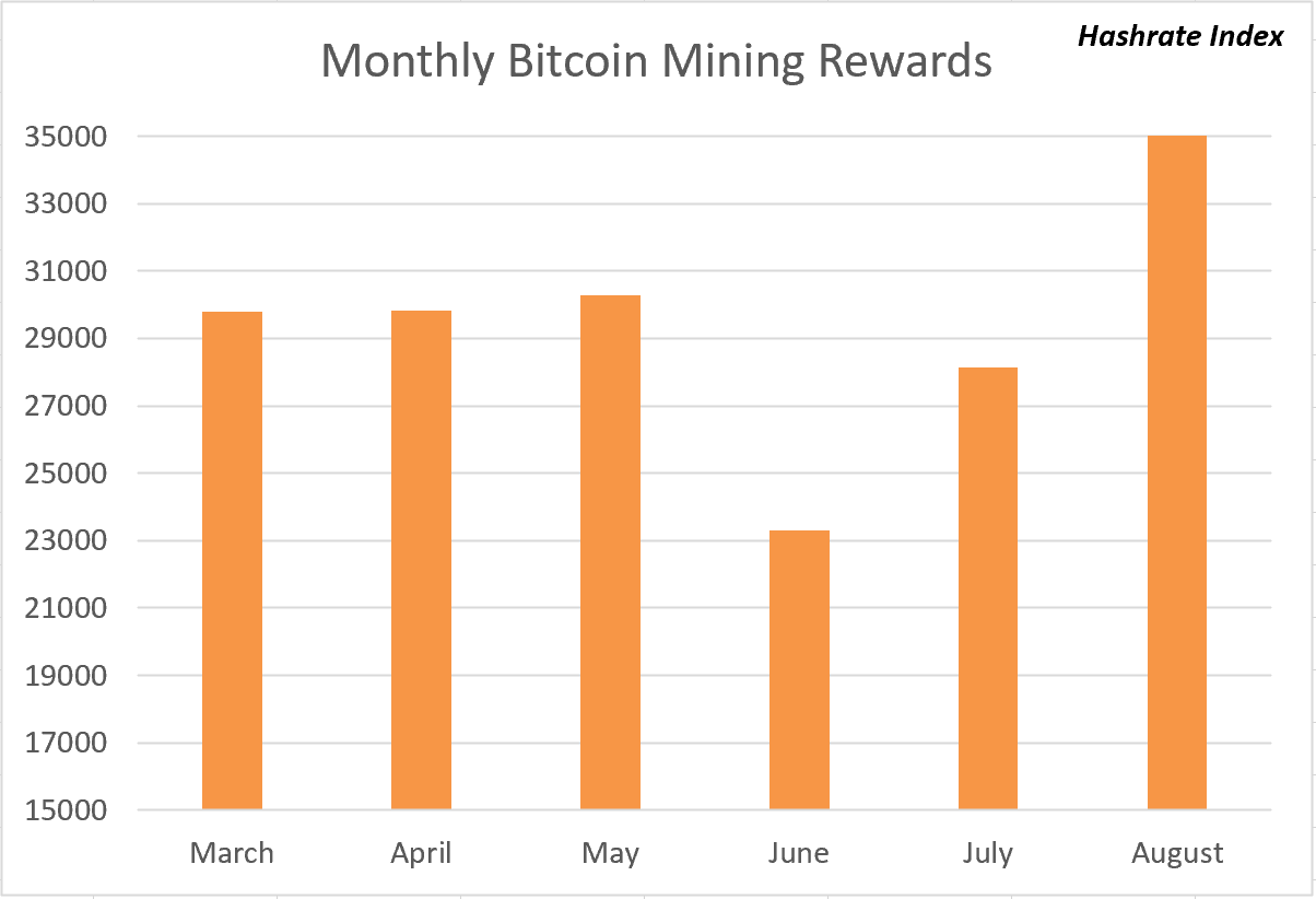 Hashrate is coming online fast. So fast, that the difficulty adjustment is having a hard time keeping up. Case in point: Bitcoin miners earned 35,065 BTC in block rewards in August, up 15% from May, 33% from June, and 23% from July.