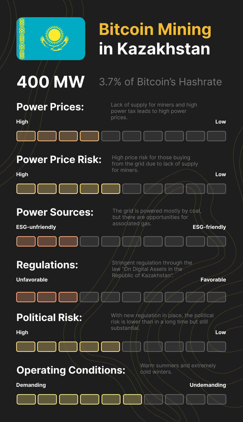 I recently spent two weeks in Kazakhstan and met with industry insiders. In this article, I explain what characterizes bitcoin mining in Kazakhstan and analyze how the new regulation could affect the industry. I also discuss what the rest of the world could learn from seeing the political risk play out in the country.