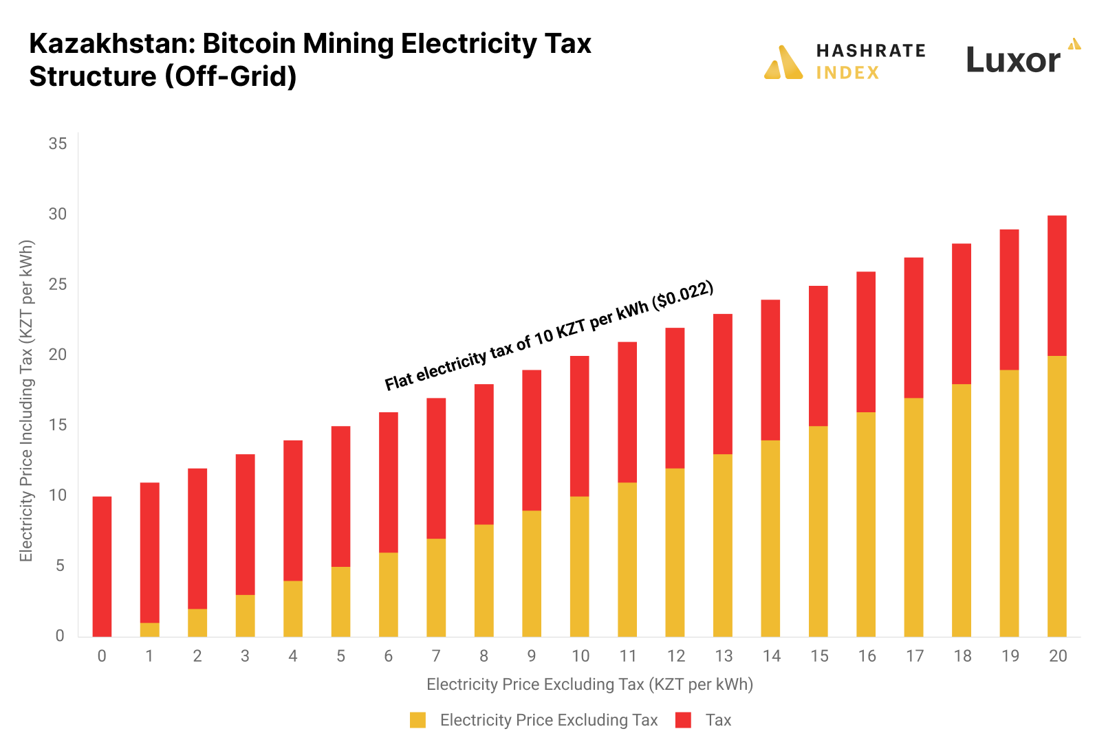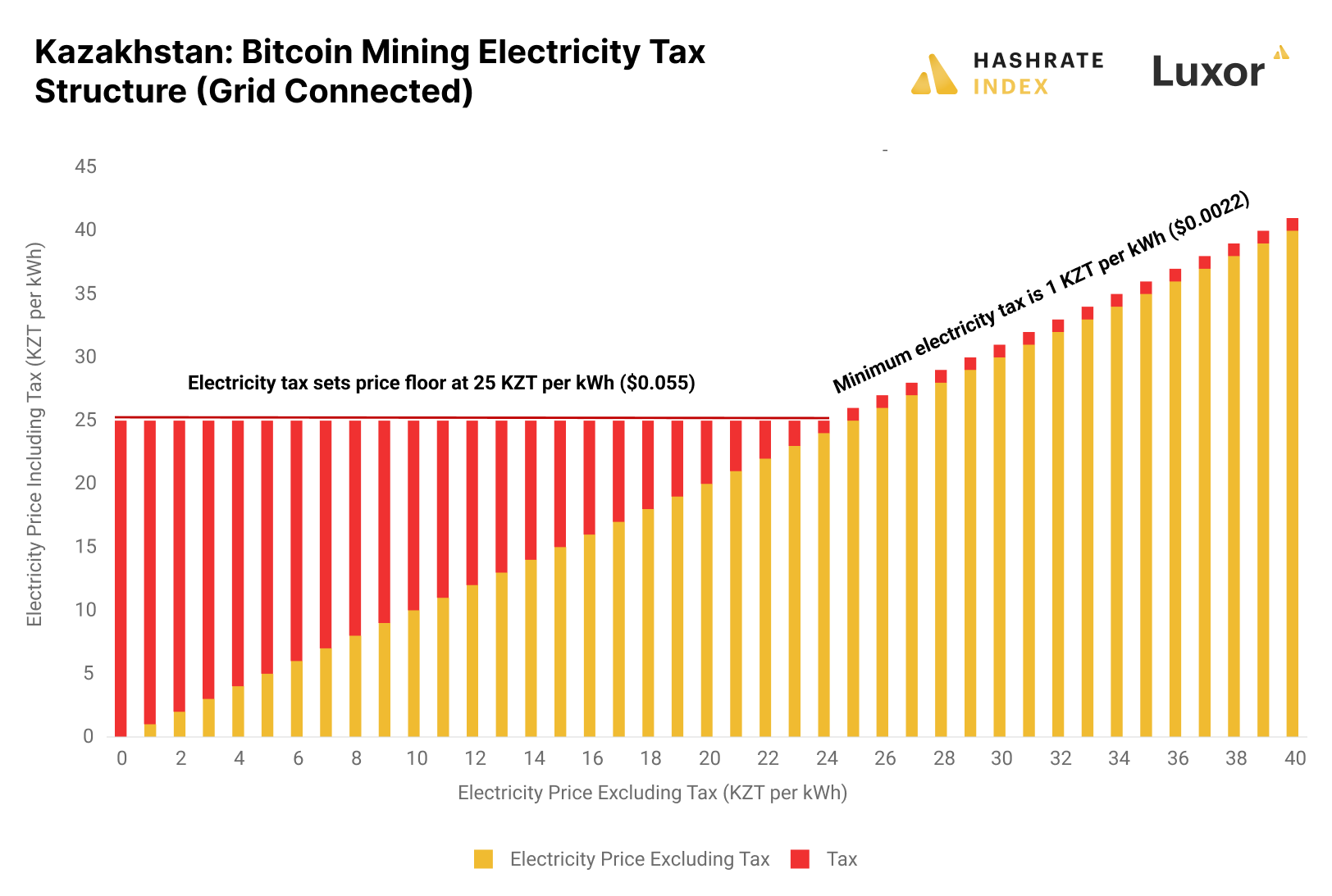 This taxation structure further reduces the viability of grid-connected mining in Kazakhstan. Even if miners could secure cheap grid-delivered electricity, the heavy taxation would ensure they paid a relatively hefty rate after all.