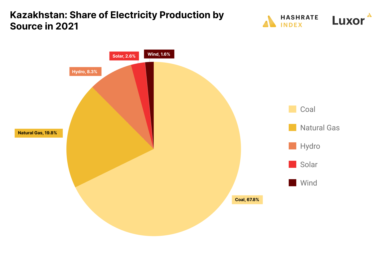 You might find it bizarre that the world’s biggest uranium producer has no nuclear power-generating capacity. However, the country has plans to build new nuclear power plants totaling a capacity of 2.4 GW by 2035 that will be fueled by locally sourced uranium. Still, 2035 is far into the future, particularly for the high-time preference bitcoin mining industry. Therefore, coal will continue being the base load generation in Kazakhstan for the foreseeable future, albeit with slightly growing shares of wind and solar.