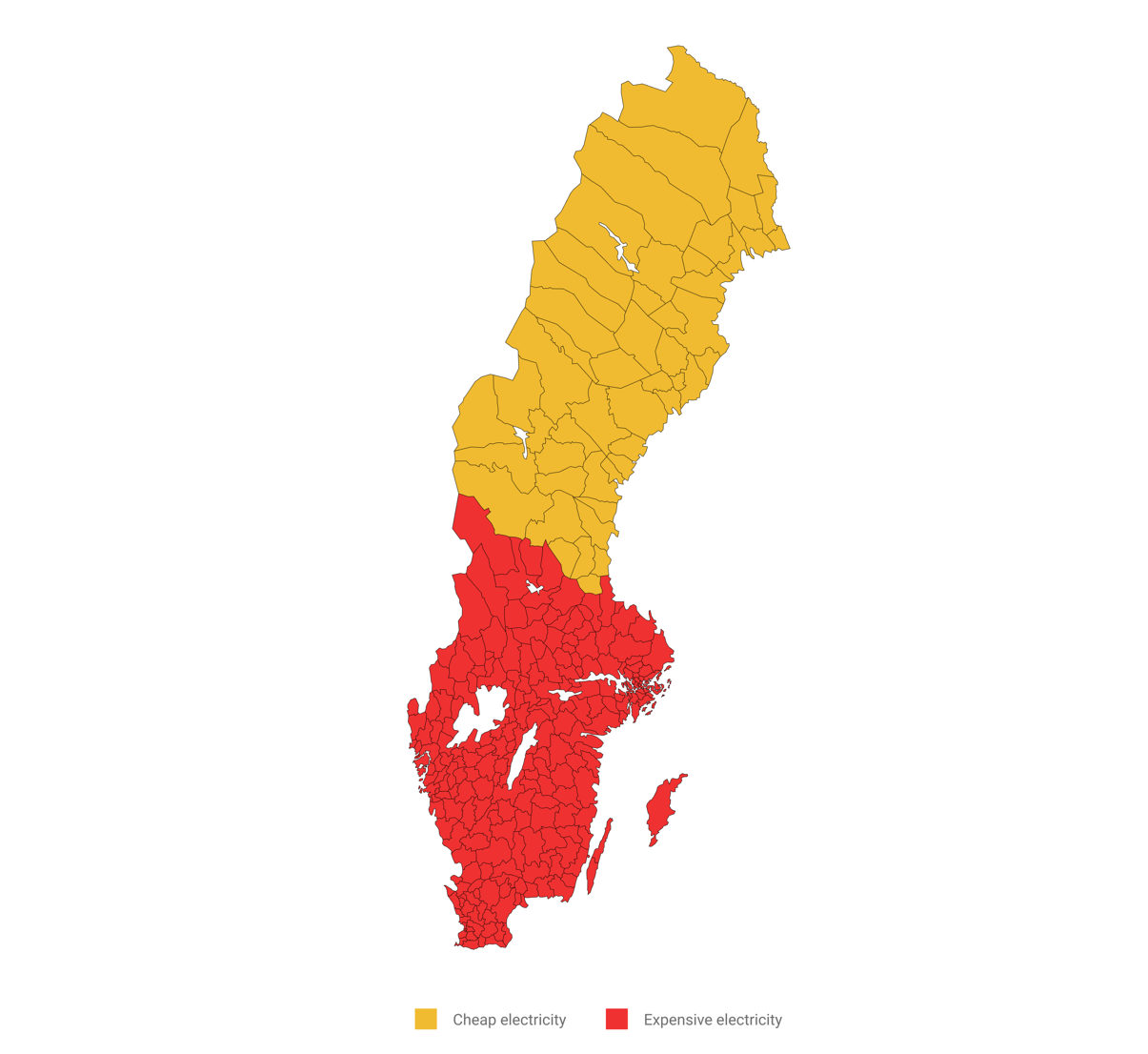 Due to transmission constraints, the Swedes have split their electricity market into four price zones. In this article, we will refer to the two northernmost price zones as “northern Sweden” and the two southernmost price zones as “southern Sweden”. As shown in the map above, electricity is cheap in the north and expensive in the south.
