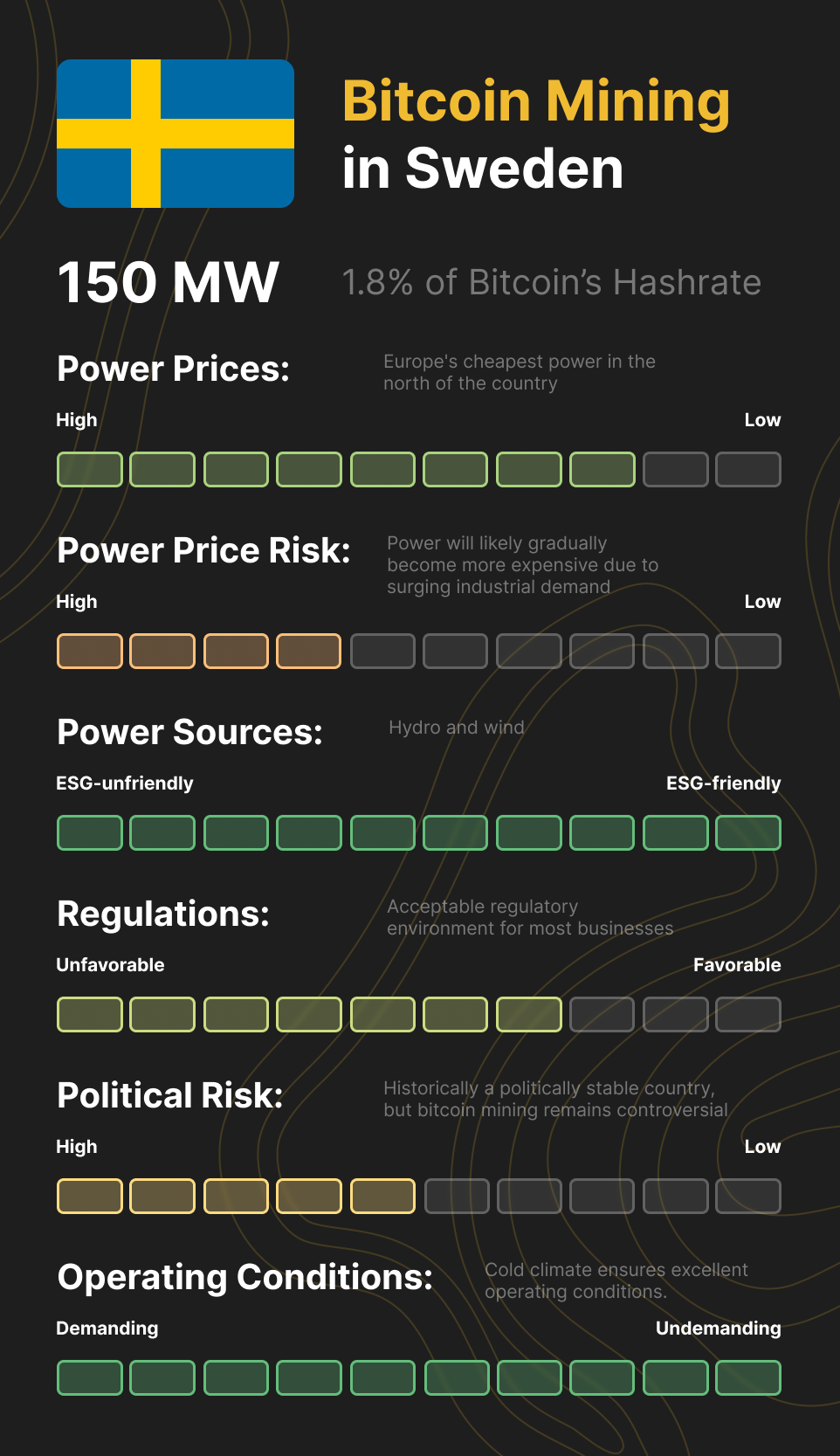 Sweden has historically been a politically stable country with an excellent regulatory environment for most businesses. Still, bitcoin mining remains controversial. Swedish regulators are eager to reduce the industry's size to make room for other electricity-intensive industries that align with Sweden’s and the EU’s ambitions, and recently proposed to increase power taxes from July 1st, 2023.