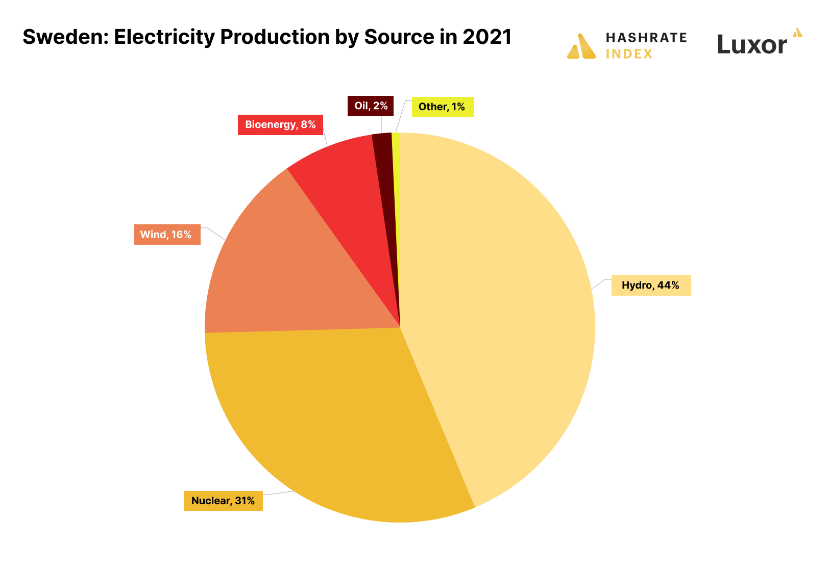 Sweden has become a popular destination for bitcoin miners looking to claim carbon neutrality, as 98% of the electricity comes from ESG-friendly sources. A combination of hydro and nuclear is the backbone of the electricity system, with 44% and 31% generation shares, respectively. The country also sees a rising share of wind power, which currently generates 16%.