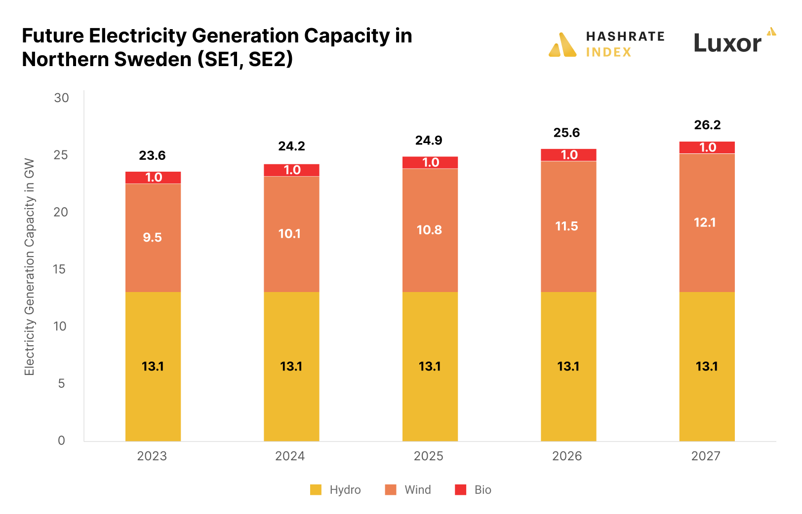These industrial projects are heavily tied to the EU’s and Sweden’s ambitions regarding the energy transition and include battery factories, green steel production, and the electrification of Europe’s largest iron ore mine. All these projects will demand enormous amounts of electricity. For instance, the electrolyzer that will generate hydrogen for green steel production will consume 800 MW by 2030 - more than five times as much as Sweden’s entire bitcoin mining industry. The electrification of the iron ore mine demands even more electricity, as it will require an estimated 2,300 MW by 2030.