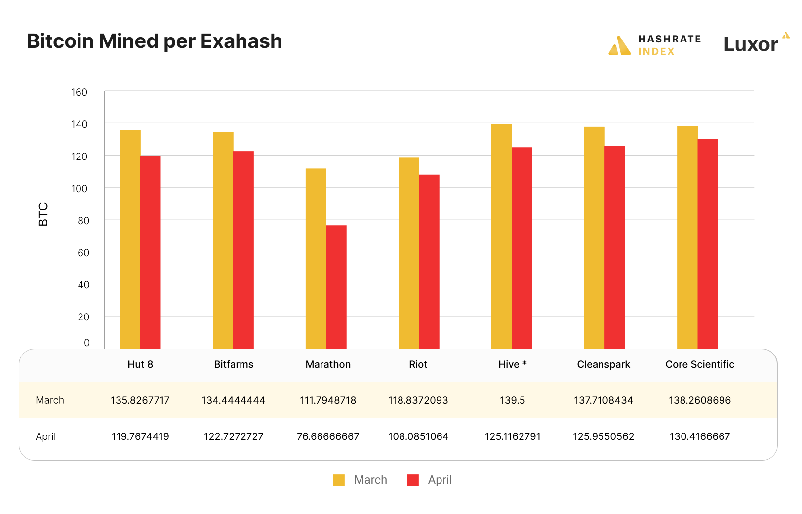 Bitcoin's hashrate increased 10% over April, from 204 EH/s on April 1st to 225 EH/s on May 1st, resulting in an all-time high difficulty of 29.79 T. We can see the tole this competition is taking on the public miners, each of which mined fewer BTC per EH/s of hashrate in April than March.