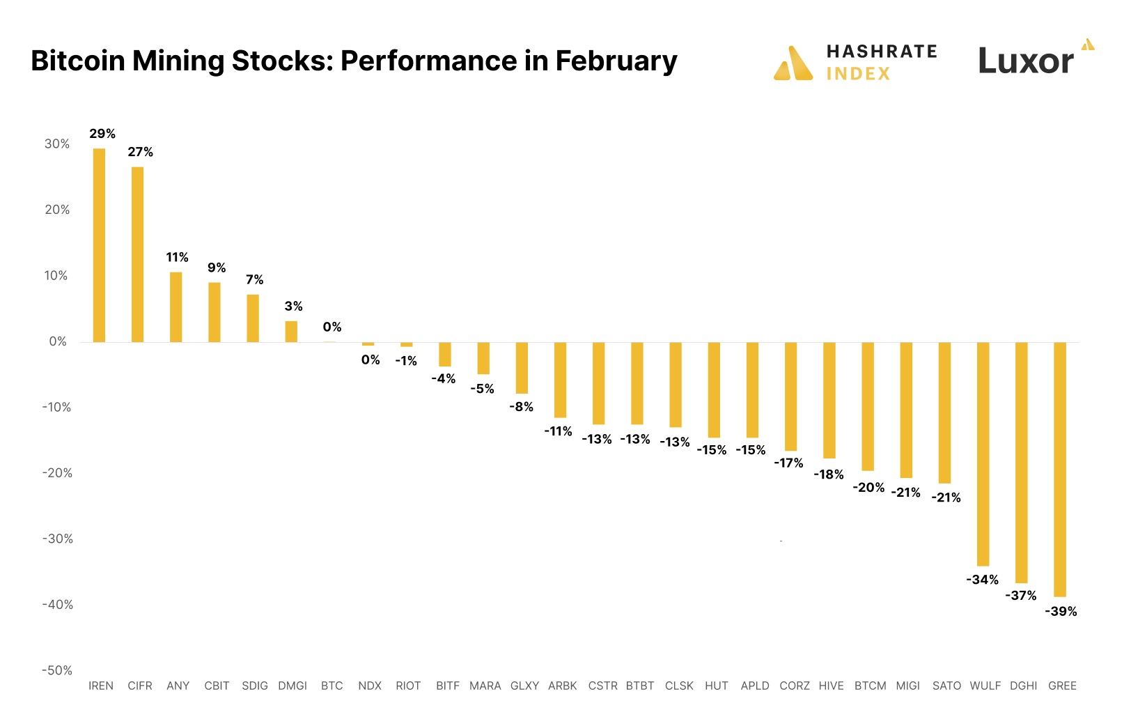 Of our 25 bitcoin mining stocks, only five beat bitcoin in February, most falling between 10% and 20%.