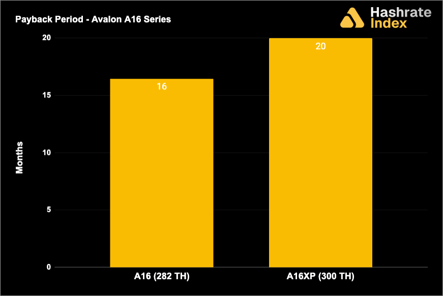 These machines arrive at a crucial moment. Post-halving economics have compressed margins, making efficiency a critical determinant of fleet profitability. For miners operating on tight power budgets, each joule saved directly translates into hashprice resilience and stronger cash flow per kWh. At current hashprice levels, the A16 and A16XP entail payback periods of 16 and 20 months, respectively: