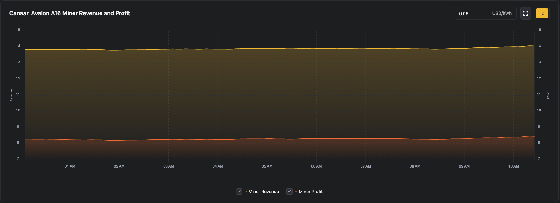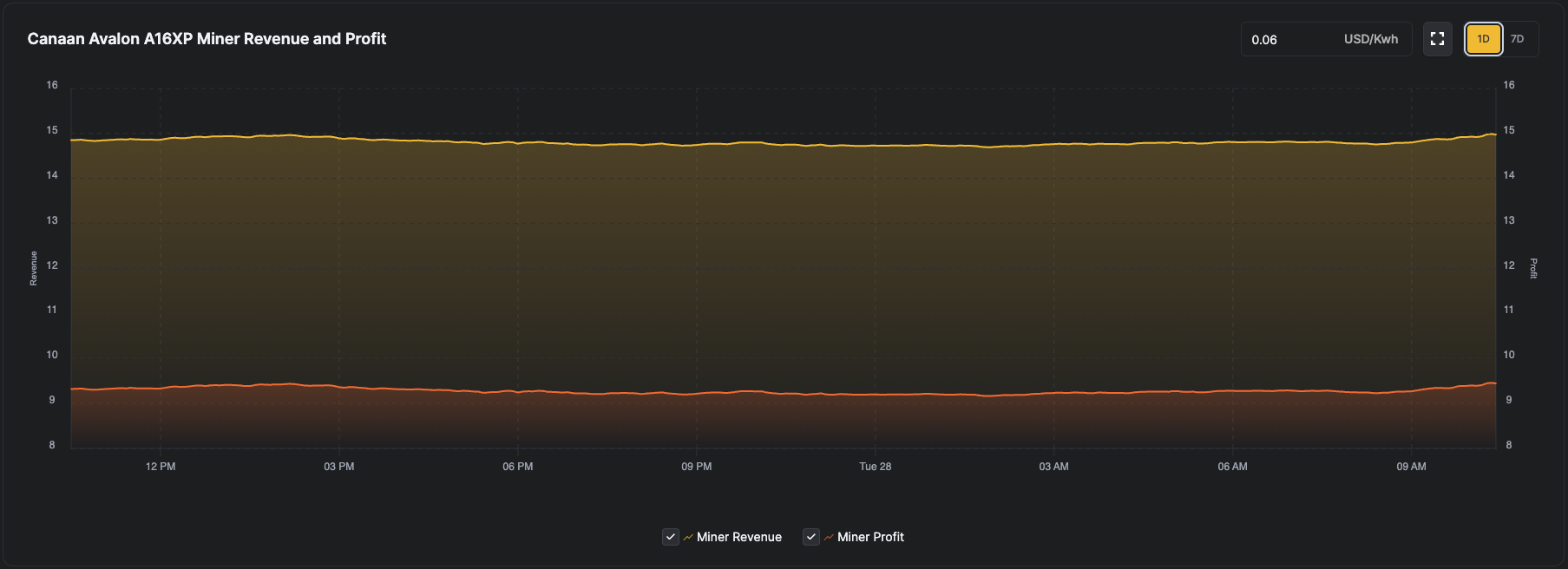 At a $0.06/kWh electricity rate, the A16XP yields approximately $9.44 in daily profit, or about $3,446 annually: