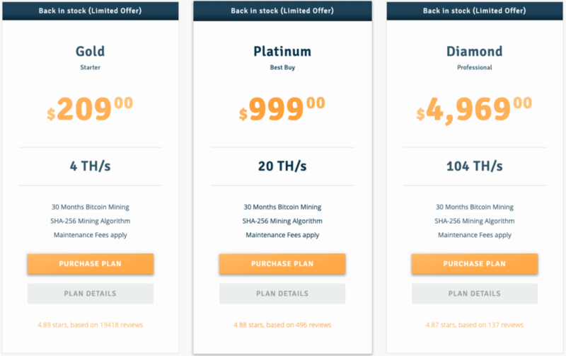 Below is an example of three mining contracts offered by Genesis Mining. In the Platinum contract a user puts in $999 USD and a maintenance fee of $0.03 per TH/s per day to receive 20 TH/s of hashing power for 30 months.