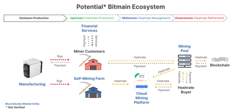 Bitdeer is one of the most interesting companies in mining. As a Bitmain subsidiary it sits at the center of many mining products including Bitmain (manufacturer + farms), Antpool, BTC.com, Via.BTC, Matrixport etc. It is also interesting because it has allowed us to reimagine the way in which hashrate can be traded between farms, pools, cloud mining platforms and buyers. Hashrate could theoretically change hands multiple times before it used to actually mine on the network. Below is a potential ecosystem that could exist today.