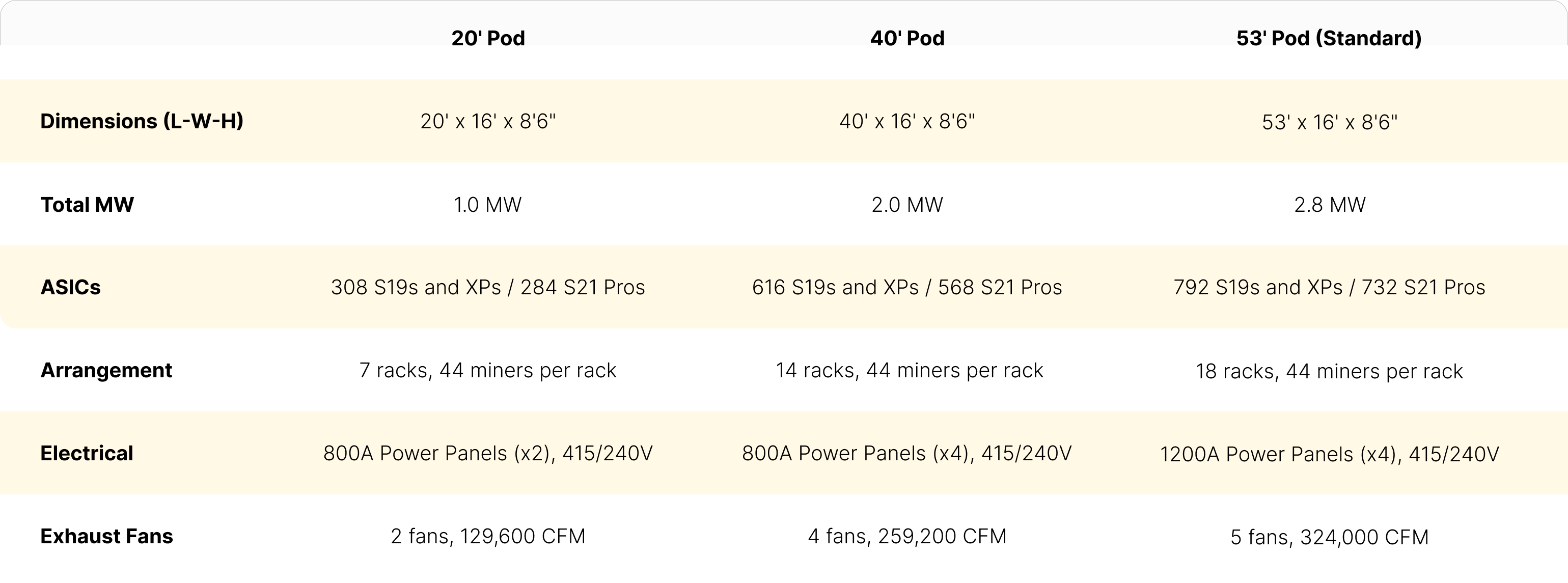 Capital Efficiency - The Pod X offers a high site density, enabling savings in site improvement and electrical costs. Boasting a fleet capacity of 792 miners, the Pod X can house 35% more ASICs than other container solutions currently available. This reduces the pod's infrastructure dollar-to-kilowatt cost ratio: for a total price of $442,000, the Pod X comes out to $158/kW versus industry standards ranging from $160-170/kW.