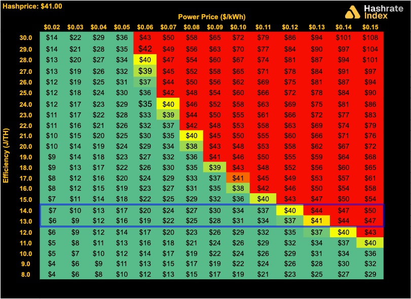 The hashcost curve below shows where the A16 Series sits relative to the range of fleet efficiency (J/TH) & power price ($/kWh) combinations associated with bitcoin mining operations at current hashprice levels: