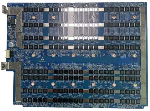 Canaan designs and manufactures its own custom aluminum heatsinks for Avalon hashboards. The heatsinks are extruded or die-cast aluminum blocks with high fin density to maximize surface area, optimized for the directional airflow produced by Avalon’s fan configuration. For air-cooled units, these heatsinks are typically soldered or bonded directly to ASIC packages using high-conductivity thermal adhesive.