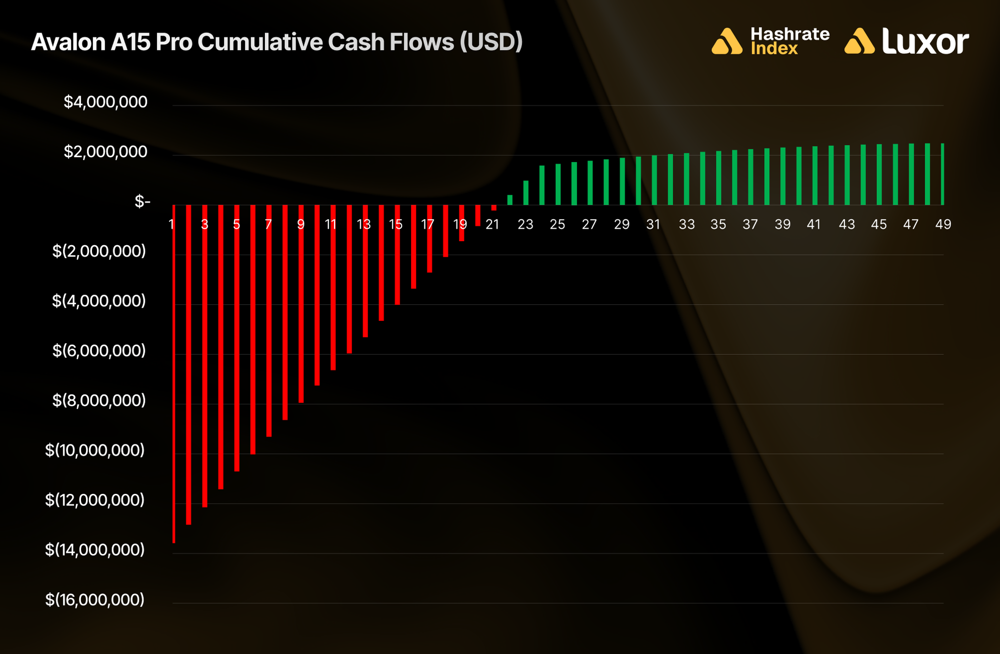 For comparison, we repeated the same exercise for a 4,525-unit (1 EH/s) Avalon A15 Pro fleet. Each unit delivers 221 TH/s at 16.8 J/TH, consuming approximately 3.7 kW at the wall. The total capital expenditure is $14.3 million, or $3,160 per unit ($14.30/T).