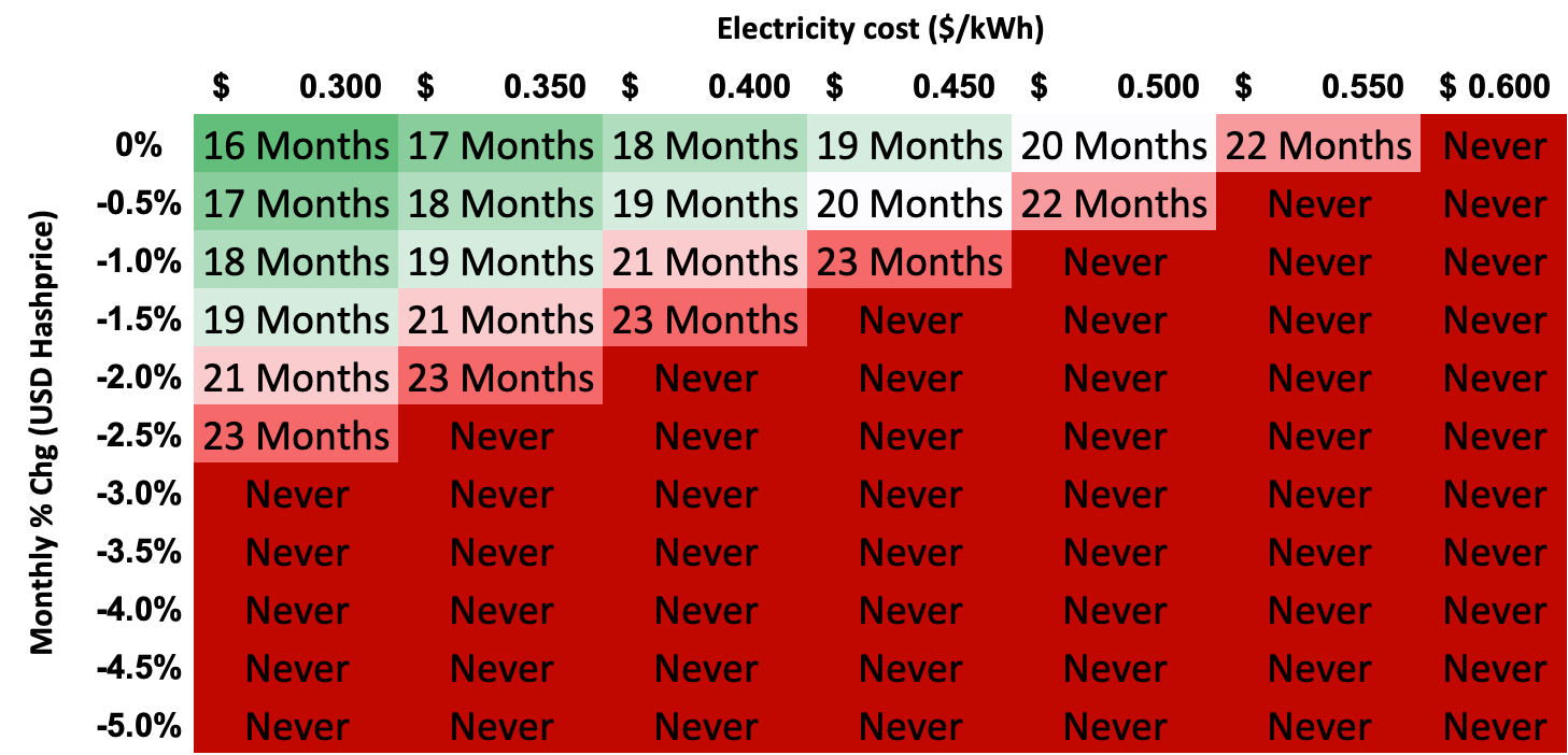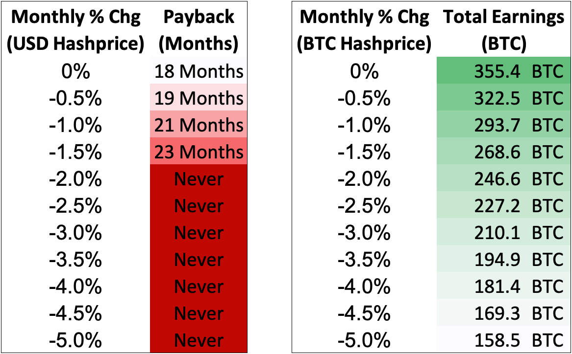Hashprice sensitivity analysis shows that the Avalon A16 fleet remains resilient under moderate compression, with payback periods ranging from 18–23 months as USD hashprice decay ranges between 0% and -1.5% per month. Beyond this range, capital recovery becomes unviable. In BTC terms, cumulative production varies up to ~355.5 BTC at a flat BTC hashprice, versus ~158.5 BTC at a -5% monthly decay.