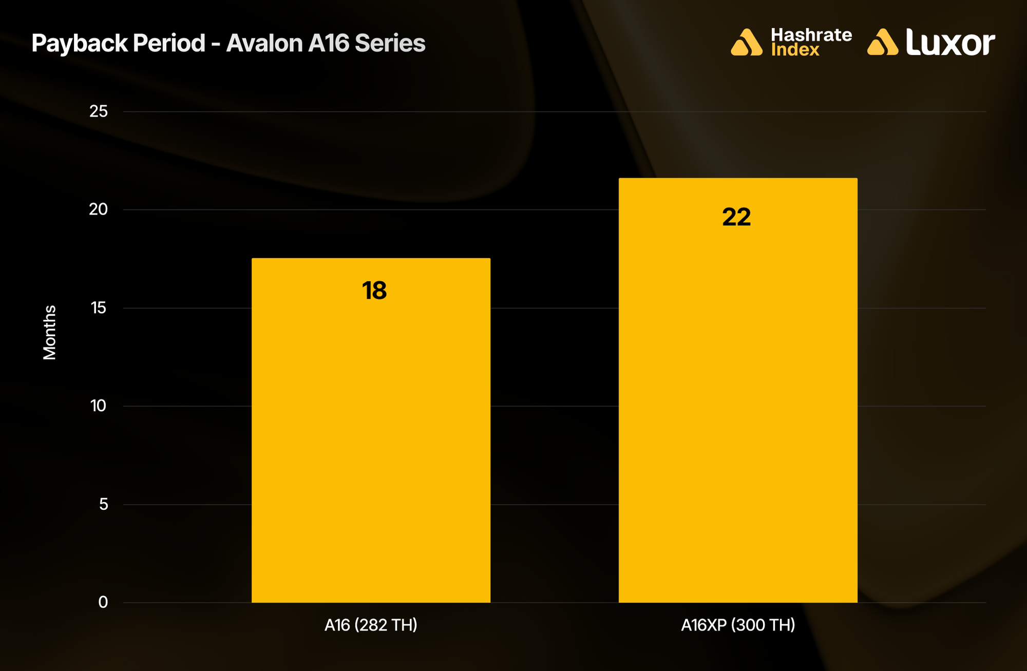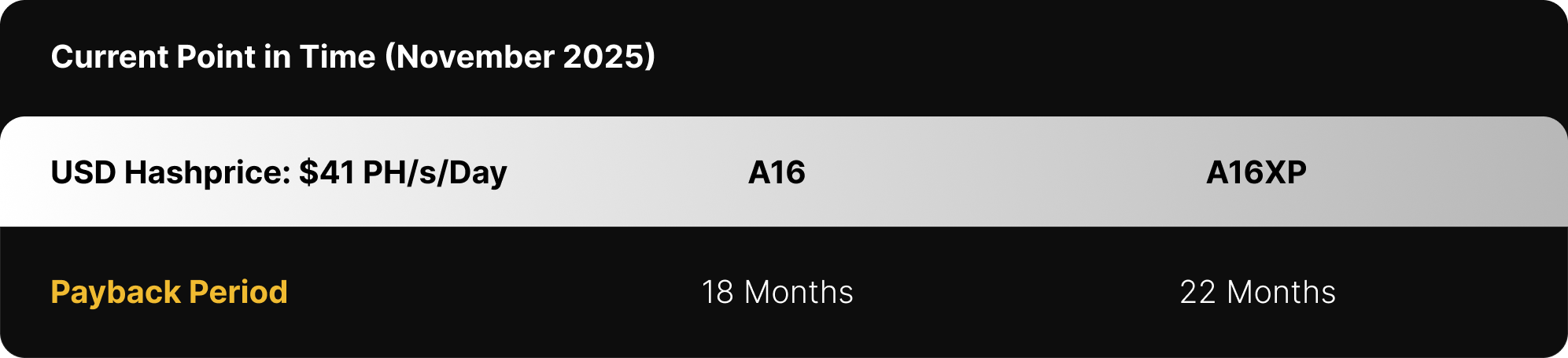 The Avalon A16 Series is Canaan’s most efficient air-cooled ASIC mining machine to date, combining 282–300 TH/s of output with sub-14 J/TH power efficiency. It demonstrates resilience under realistic hashprice decay scenarios, achieving payback in under or around two years. Based on our findings, The A16 Series is best suited for: