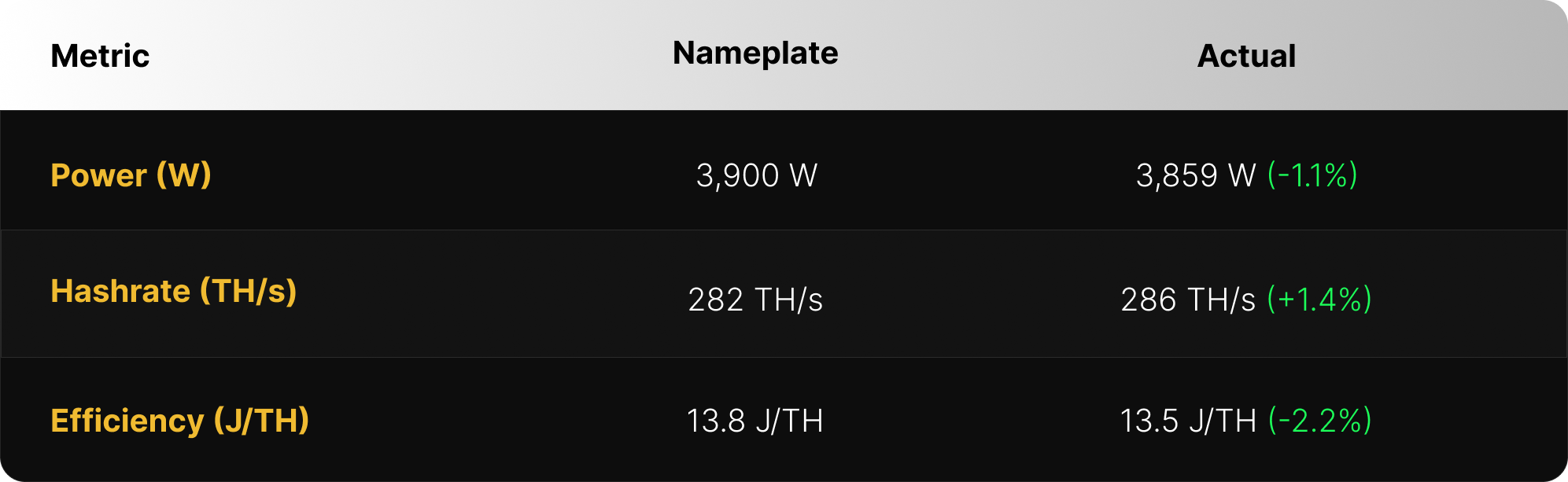 - Nameplate Efficiency: 13.8 J/TH (± ~5%)