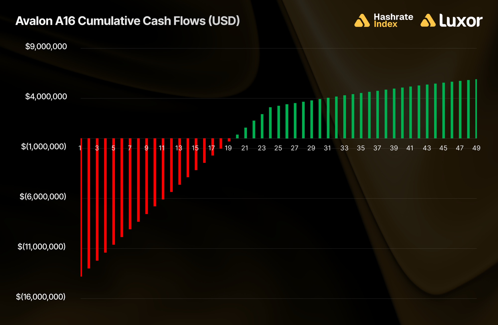 This model evaluates the projected performance and payback period of a 3,545-unit Avalon A16 fleet, representing 1 EH/s of hashrate capacity. Each unit delivers 282 TH/s at 13.8 J/TH, consuming approximately 3.9 kW at the wall. The total capital expenditure is $14.6 million, or $4,117 per unit ($14.60/T). Operations assume 95% uptime and a fixed power cost of $40/MWh ($0.040/kWh).