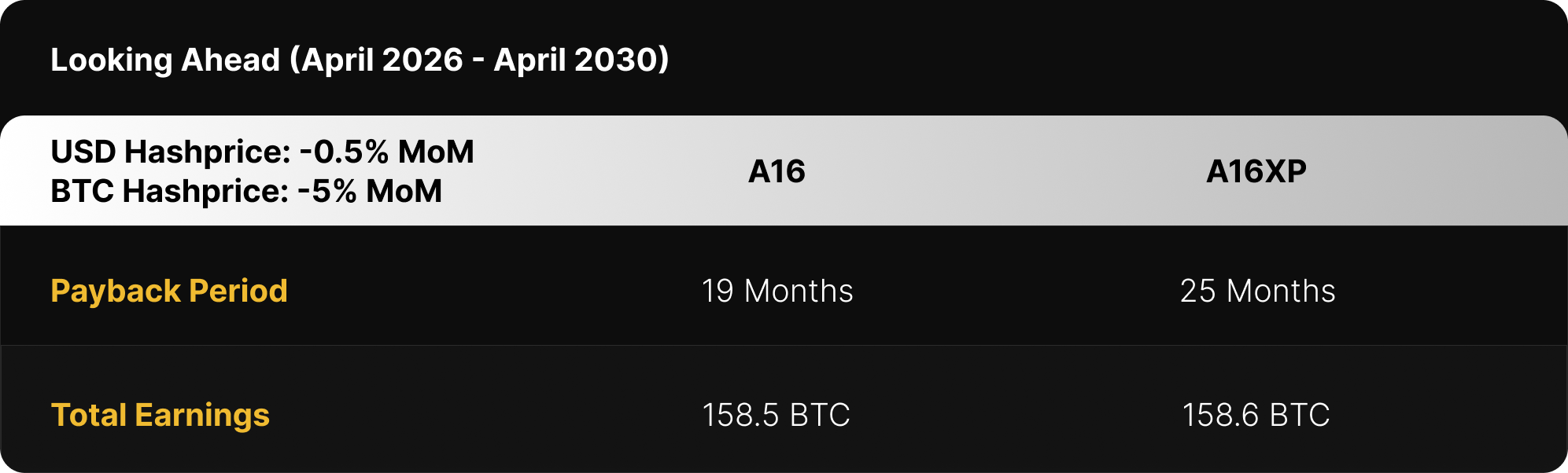 In this model, USD hashprice declines 0.5% per month — from roughly $39 to $15 per PH/s/Day between April 2026 and April 2030 — while BTC hashprice falls 5% per month, reflecting expected compression from network difficulty growth alongside the incoming 2028 halving.
