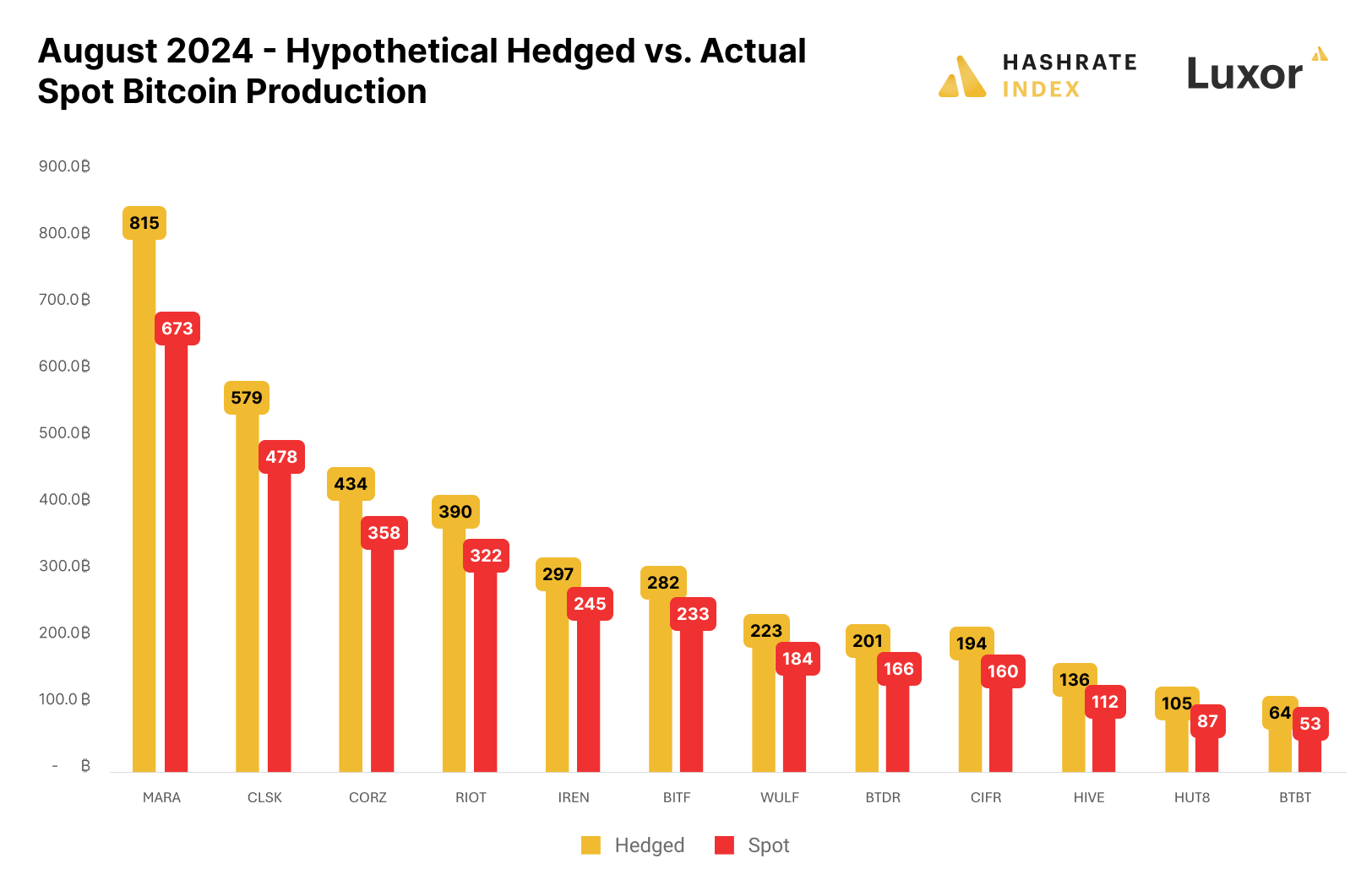 Public mining companies were not selling hashrate forward for August – an unfavorable position to be in as hashprice hit all time lows. The figure below illustrates a hypothetical scenario of how public miners' August production would have differed if they had hedged in March 2024 before the halving: