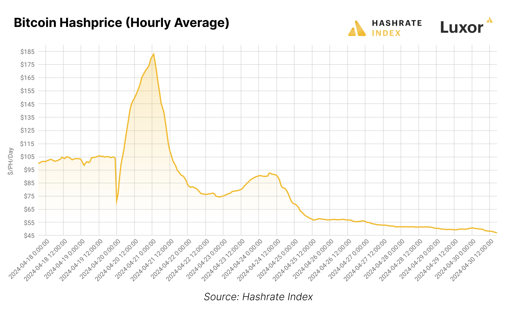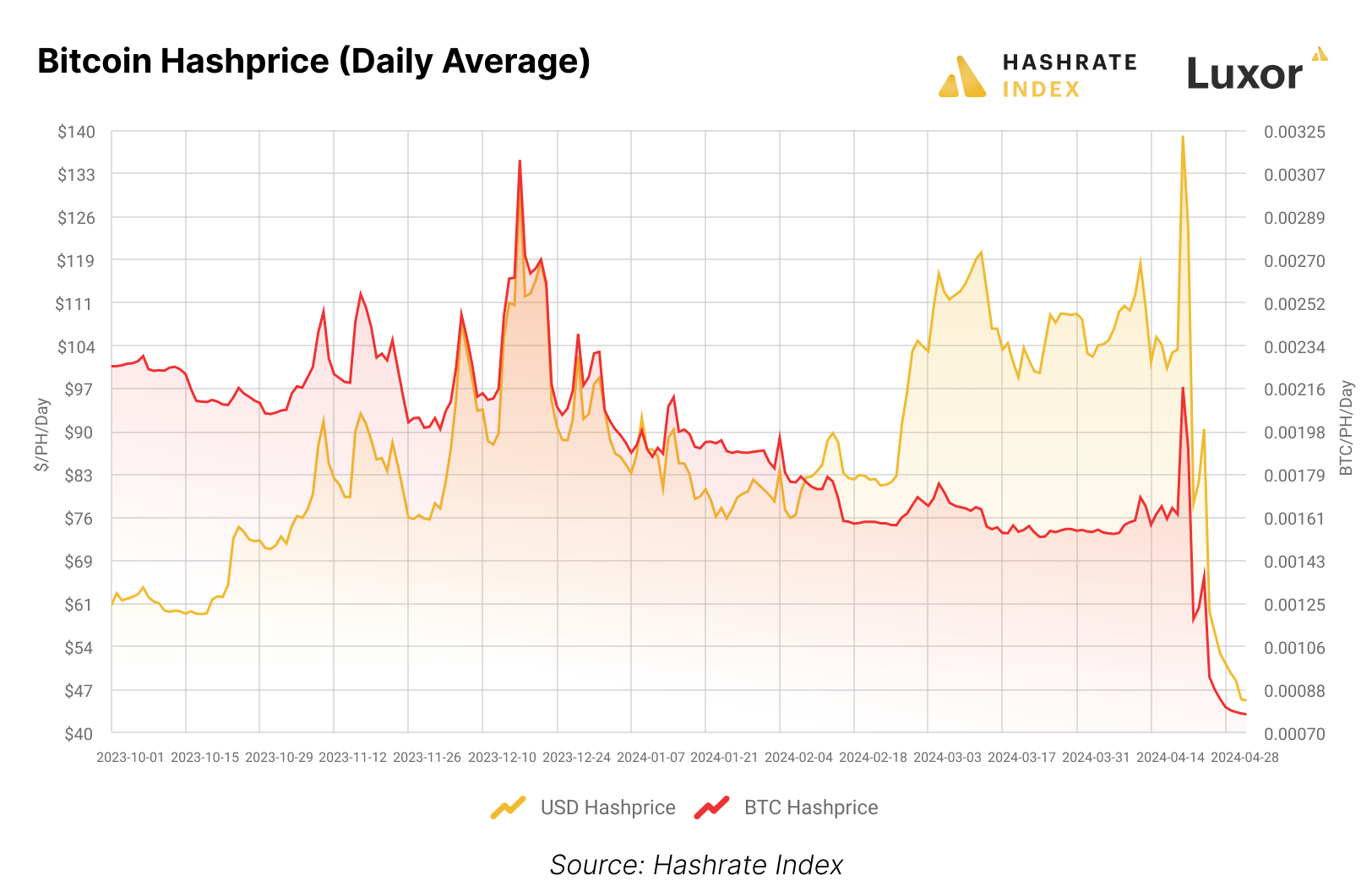 As we write this section on May 2, 2024, USD hashprice is $45/PH/Day after printing an all-time low of $44.43/PH/Day on May 1, 2024.