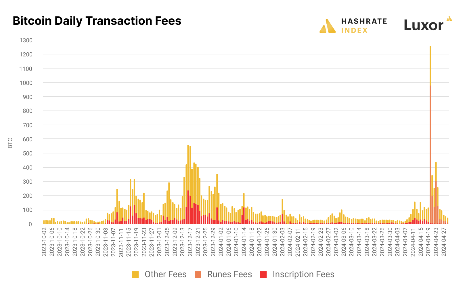 Per data from Matt Kimmell’s Dune Dashboard, Runes generated 1,819.8 BTC in transaction fees worth $117 million between the Halving and block 841,539, and they made up 43% of all transaction fees miners earned in this timeframe. For comparison, miners earned 23,445 BTC in fees worth $797.70 million in 2023.