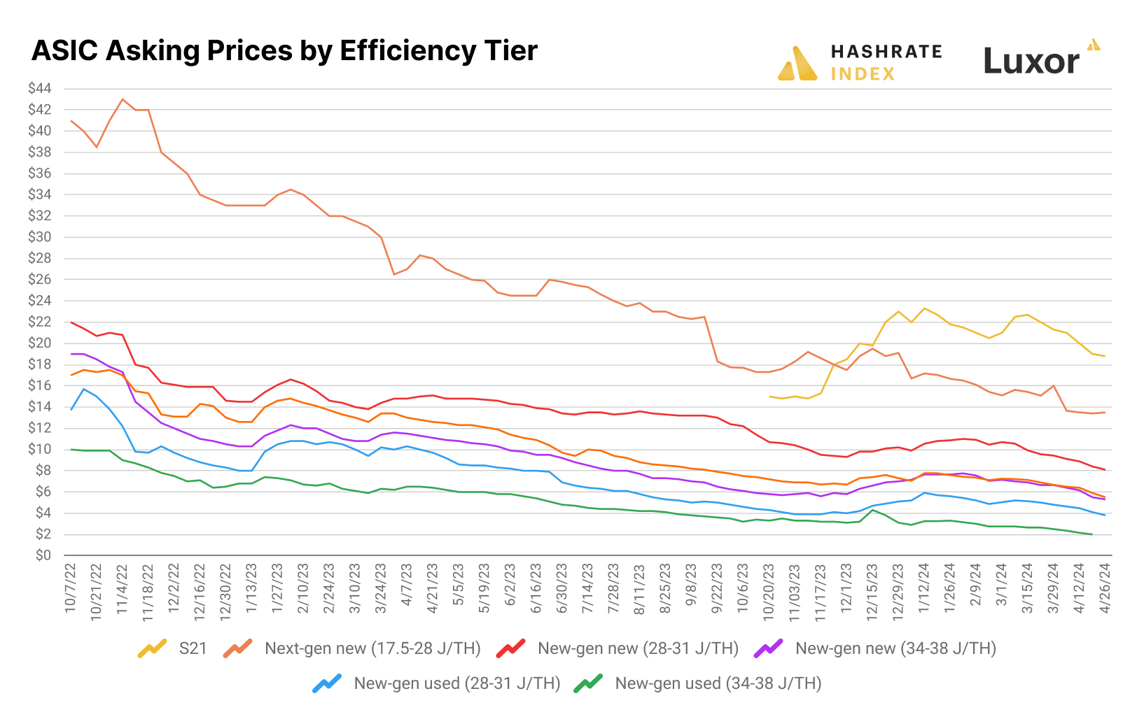 Despite further positive changes to hashprice and a higher hashprice average over the quarter when compared to Q4-2023, ASIC prices for all tiers fell over the quarter, and they continued to fall over the course of April before and after the Halving as miners and ASIC traders priced in the Halving’s impact on hashprice.