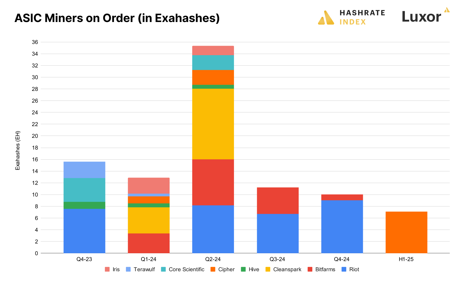 Public miners were proactive in 2023 and ordered boat-loads of next-generation rigs, namely the S21, T21, M50 series, M60 series, S19k Pro, and S19 XP. These orders will be delivered on a rolling basis throughout the year, and many miners also put money down on options to purchase additional units at a locked-in rate at a later date. Assuming these miners can deploy these units once they are delivered – and not sit on inventory, as we’ve seen in the past with mass ASIC orders – then 2024 and 2025 will see a tidal wave of hashrate come online from these public companies. Case in point, the top public miners have had 76.6 EH/s worth of equipment on order for 2024, 12.9 EH/s of which should have been delivered in Q1-2024 assuming delivery timelines stayed on track.