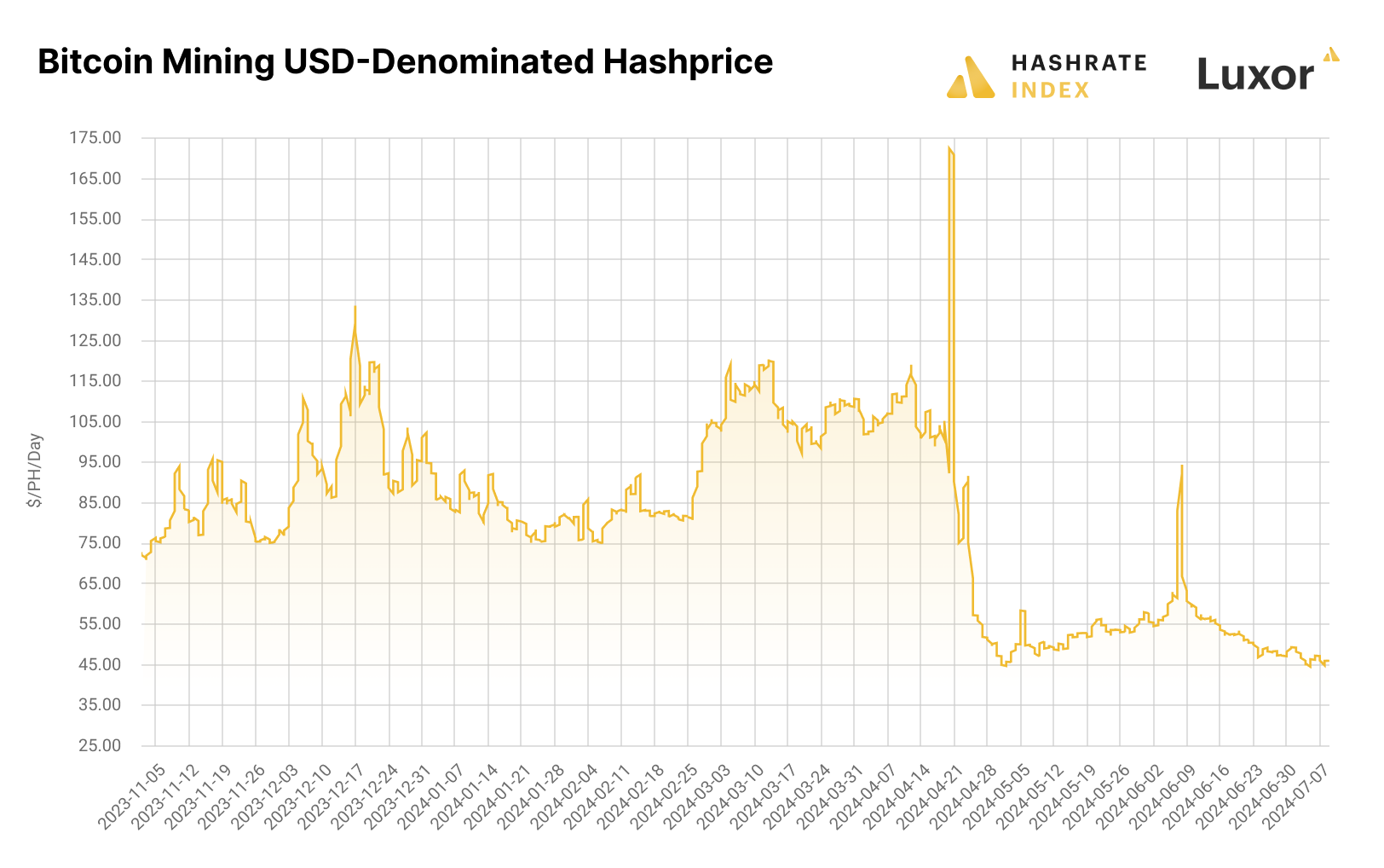 Hashprice had a strong Q1, which cushioned the blow of the Halving’s effect on hashprice somewhat. But the pain came all the same, and hashprice hit an all-time low of $44.43/PH/day on May 1. Since then, hashprice has printed yet another all-time low of $44.31/PH/day on July 5. As of June 17, 2024, USD hashprice is $52.18/PH/Day.
