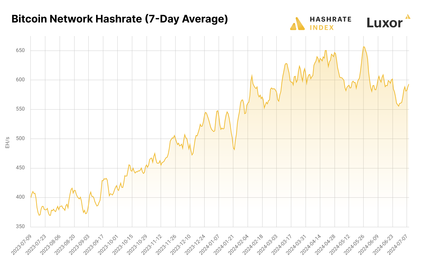 Naturally, hashrate has been in decline since the Halving given the event's effect on hashprice. At the time of writing on July 17, Bitcoin’s 7-day average hashrate is 604 EH/s, a 8.2% decline from its all-time high of 658 EH/s on May 26. This late-May surge to an all-time high was an aberrant, last gasp spurt for the quarter’ hashrate growth before transaction fee volumes deflated and Bitcoin’s price took a turn for the worse; over Q2, Bitcoin hashrate fell -7.3% – a rare occurrence of negative quarter-over-quarter change.