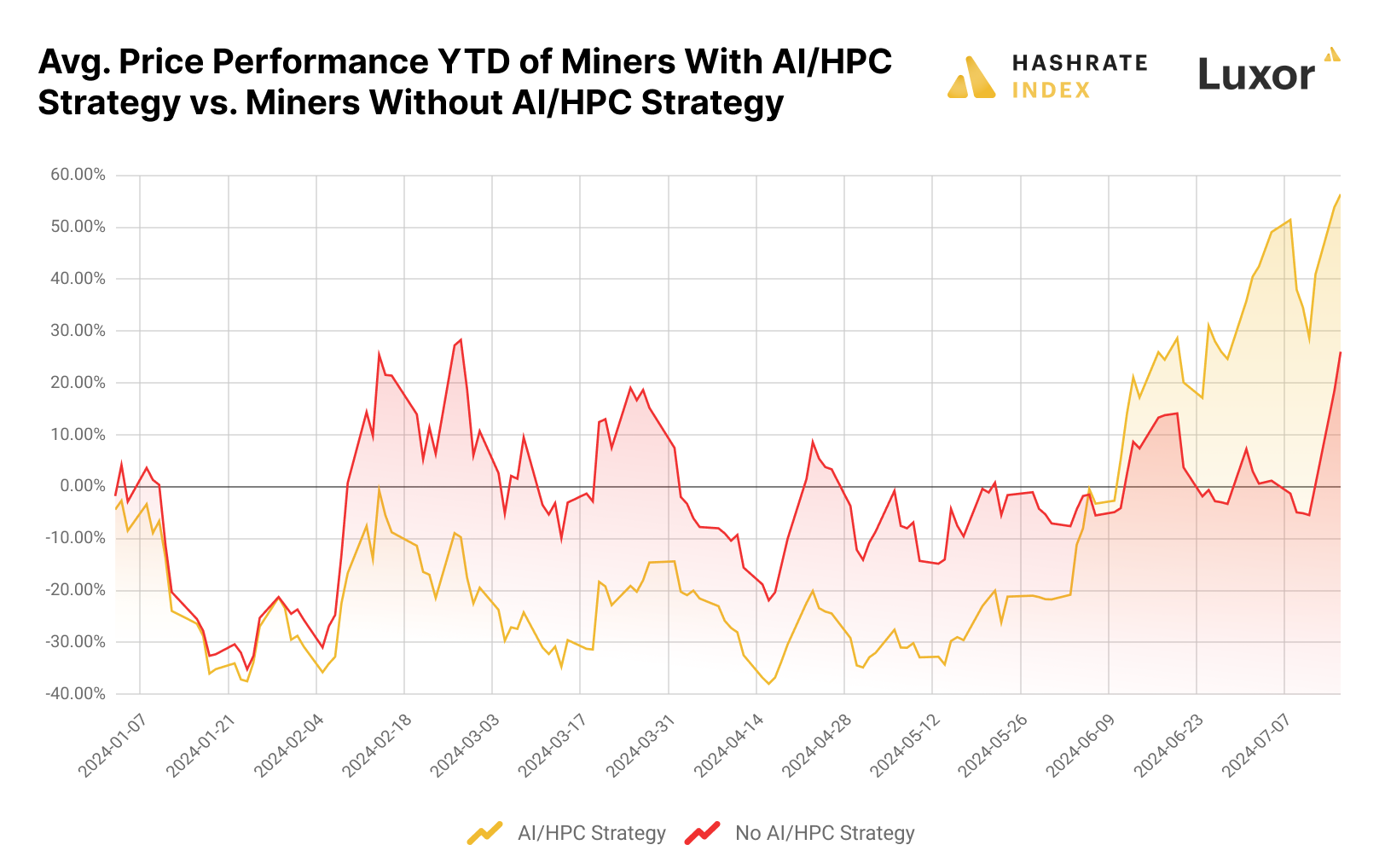 That said, there has been a clear divergence this year between Bitcoin miners that are executing or have announced an AI / high-performance compute (HPC) strategy. If we break out average returns between AI / HPC-focused and traditional miners, it becomes clear that the market is rewarding miners that are advertising nascent AI / HPC strategies. By Q2 close, AI / HPC miners were up 25% year-to-date, while traditional miners were down 3%. At the time of writing on July 15, the year-to-date returns for AI / HPC miners and traditional miners were 56% and 26%, respectively.